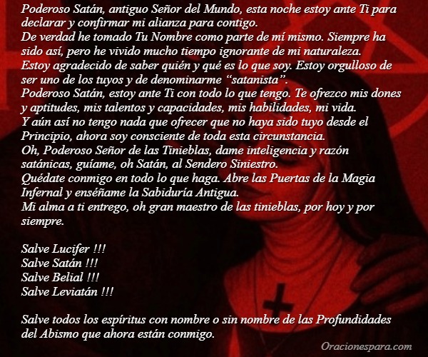 Poderoso Satán, antiguo Señor del Mundo, esta noche estoy ante Ti para declarar y confirmar mi alianza para contigo.